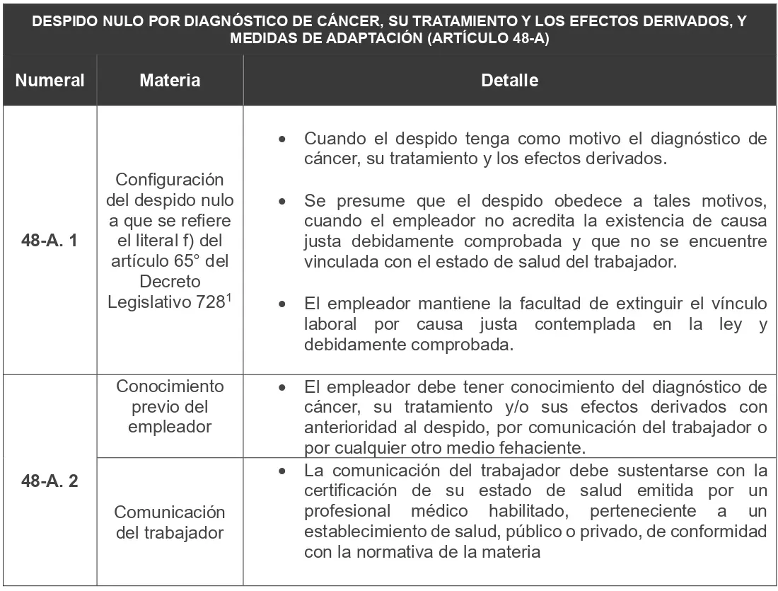 1 Recordemos que en setiembre del año pasado, mediante la Ley N° 32431, se incorporó el despido nulo por diagnóstico de cáncer dentro de las causales contenidas en el artículo 65° del Decreto Legislativo 728.